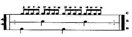 HINT: Boven het 16th rock voorbeeld zie je een telling staan. Dit wil nogal eens helpen om deze telling hardop mee te doen “ene, en e tweeje en e . . . etc.etc.. Zeg hardop EN bij iedere “+”. Stamp met je voet bij EEN en sla met je linkerhand op je bureau bij TWEE. Probeer het! Baadt het niet, schaadt het niet!!